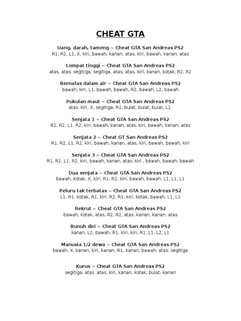 Download kode gta san andrea ps2 (bahasa anak anak :d). Atas, atas, segitiga, segitiga, atas, atas, kiri, kanan, kotak, r2, r2. Berbagi ke twitter berbagi ke facebook. Cheat gta san andreas untuk kamu yang menggunakan ps2. Lewat cheat gta ini kamu bisa melakukan berbagai aksi yang tidak biasanya dan membuat permainan gta kamu jadi lebih seru.